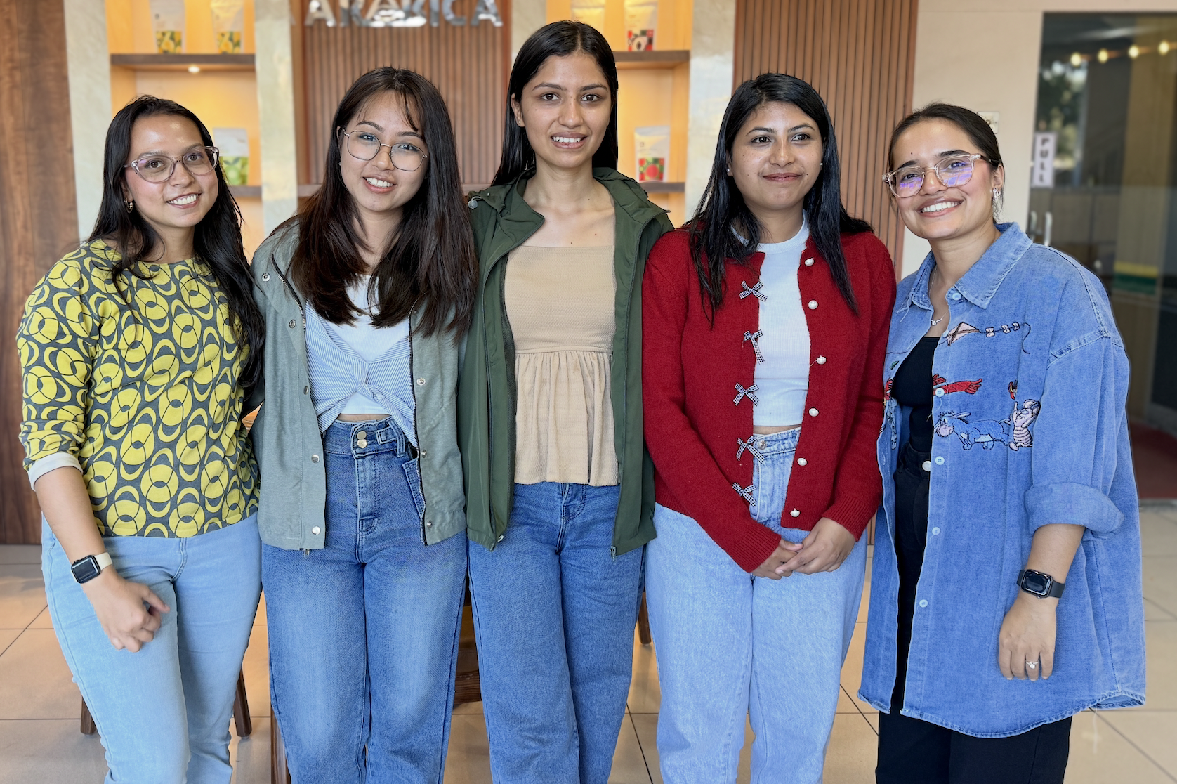 From L-R: Program Coordinator, Astha Sharma, alumni, Kriti Prajapati, Pratima Dawadi, Yunika Bajracharya, (all working at IT companies), and Melisha Ghimire, Managing Director, Code Rush. Yunika is creating an AI chatbot to connect Nepali women in remote areas with legal assistance.